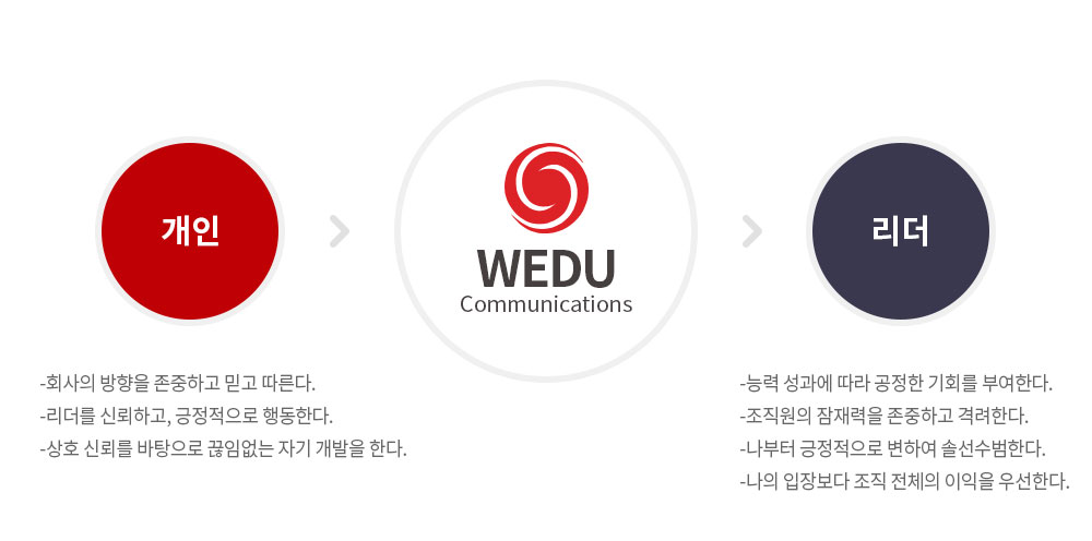 (주)위두커뮤니케이션즈는 지난 10년간 e-HRD, e-Learning Service 분야에서 다양한 프로젝트 수행 경험과 차별화된 품질을 바탕으로 관련 분야 및 해외에서도 그 실력을 인정받고 있으며, ‘No.1 ‘U’ Knowledge + Culture Communication Group’의 비전을 갖고 정진하고 있습니다.
